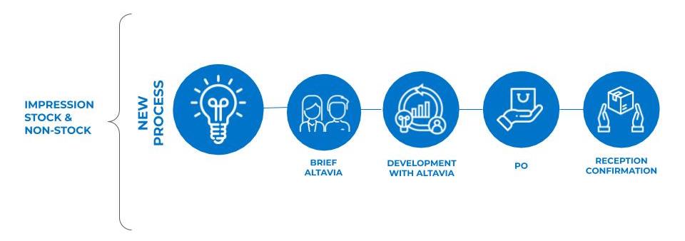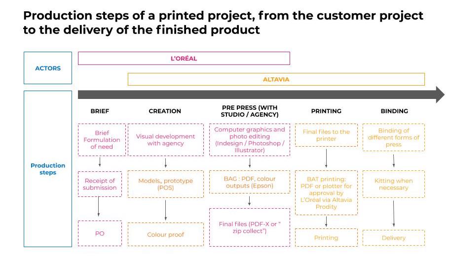 The process begins with sending the completed brief via BOL to Altavia-Prodity. L’Oréal then develops the project with Altavia, sends its PO and the product is printed and delivered.