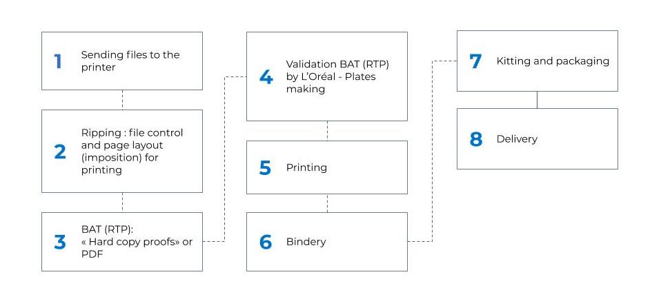 Printing: Altavia delivers the files to the printer, and then sends the paper color proofs or PDF to L’Oréal. Once the proof is approved, the project is sent to print.